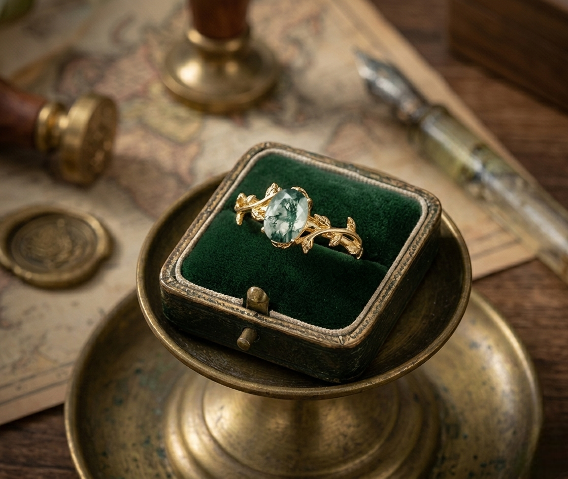 A delicate moss agate ring designed with graceful details, blending natural beauty with refined elegance for women who appreciate unique and meaningful jewelry.